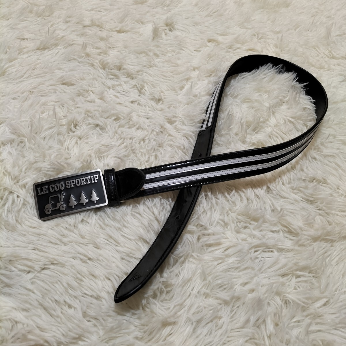 > 訳あり★ルコックスポルティフ プレートバックル ブランドロゴ 型押し エナメル レザー ベルト ブラック ツートンカラー サイズ34相当 USED