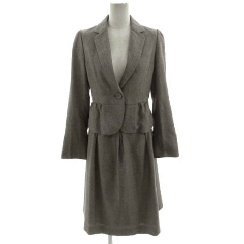 - マヌーカ MANOUQUA スーツ ジャケット テーラード ペプラム スカート タック ミディ丈 日本製 ツイード ウール混 グレー 黒 ベージュ 38