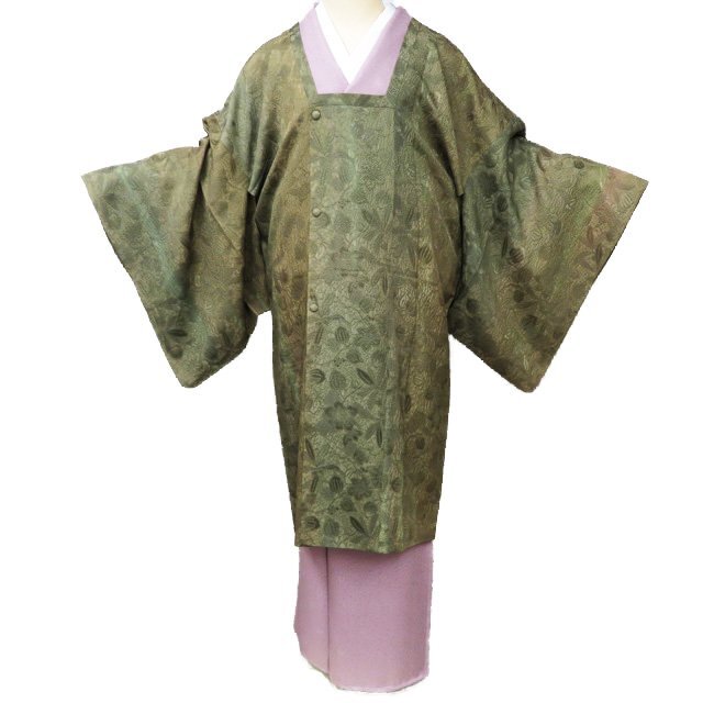 - 道行コート コート 着物 正絹 中古 地模様 花模様 黄海松茶色 海松茶色 身丈103.5cm 裄69cm きもの北條 A1097-7