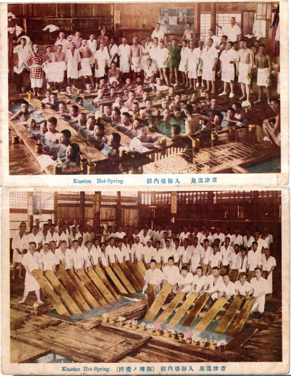 - 絵葉書 草津温泉 入浴場内部・浴槽ノ攪拌 群馬県観光温泉入浴風景絵はがき エンタイア実逓便2枚