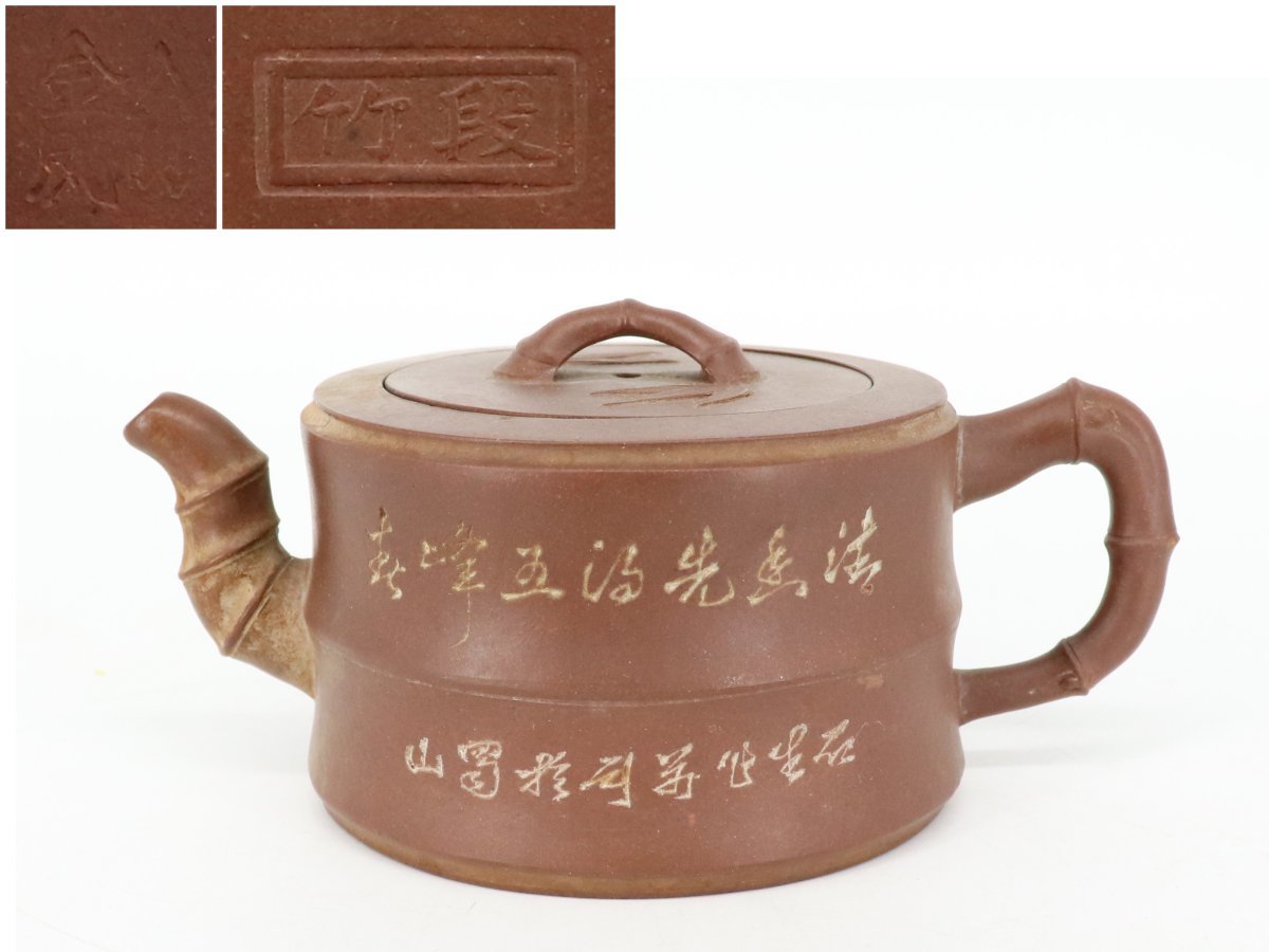> 【蔵】中国古玩 竹段 朱泥 急須 紫砂 後手急須 大振急須 唐物 煎茶道具 Y1026