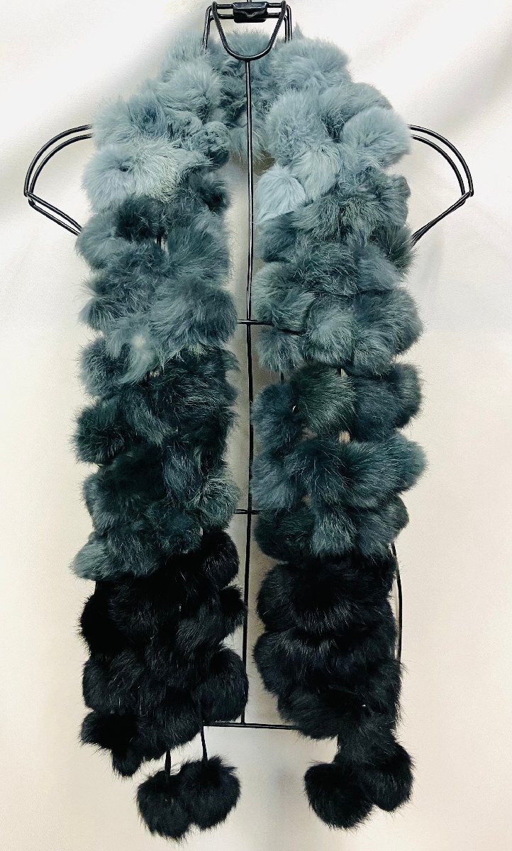 - qof.ZO801 ラビット毛皮 4連ボンボン ショール 襟巻き 13cm×140cm グレー×ブラック グラデーション