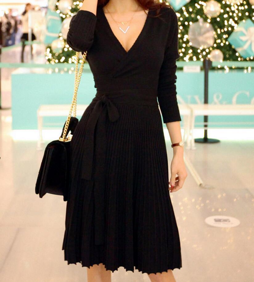 - 秋冬 / 上質 Vネック 着やせ ニットワンピース 優雅で 長袖 プリーツワンピース お呼ばれお出かけ 披露宴 発表会 ニット ひざ丈ワンピース