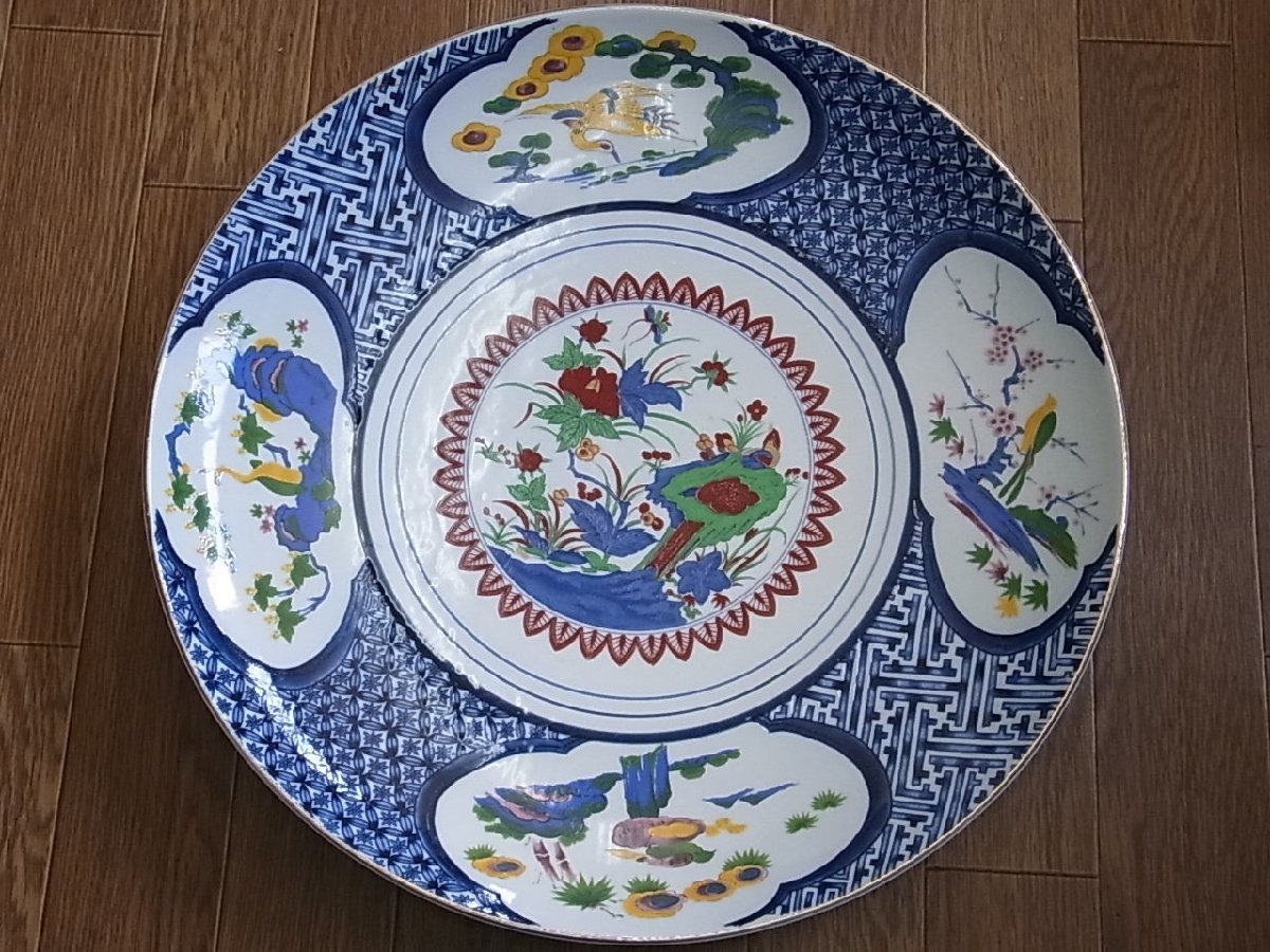 - 【完品】 有田焼 華山作 色絵 金襴手 大飾皿 窓絵 花鳥図 直径/41.5cm