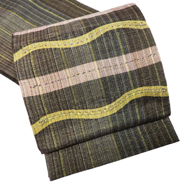 - 袋帯 中古 リサイクル 正絹 カジュアル 仕立て上がり お太鼓柄 組織り 金通し マルチカラー 茶系色 多色 きもの北條 A1101-10