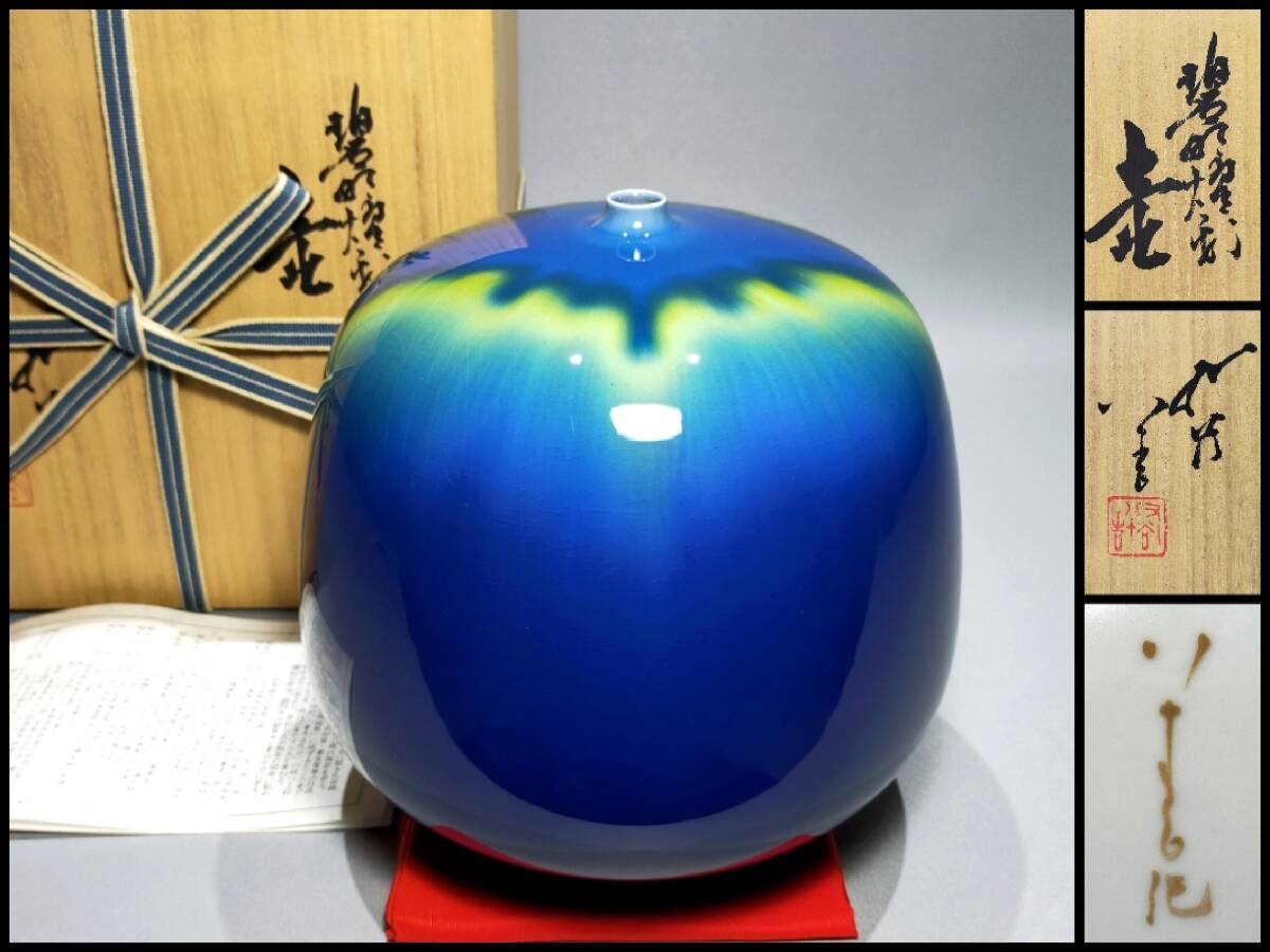 > IA08 九谷焼 花瓶 人間国宝 三代 徳田八十吉 造 金銘 本人作 碧明燿彩 壷 高19.8㎝ 栞・共箱
