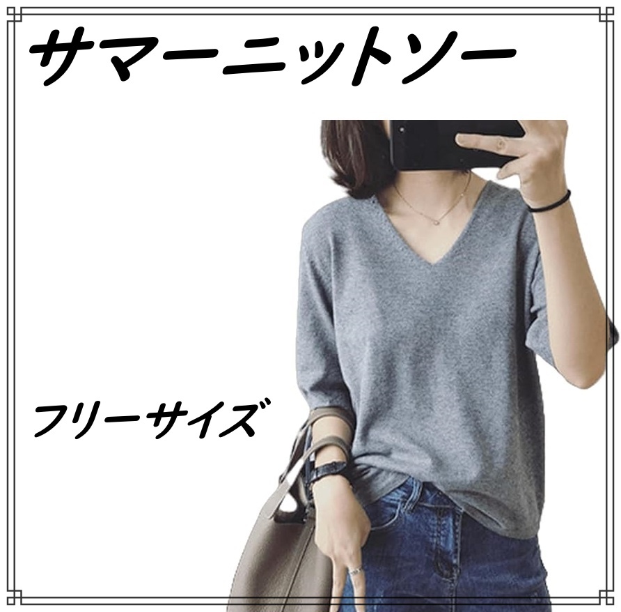 - mum Vネック サマーニット レディース ファッション トップス 美シルエット きれいめ 五分袖 (グレー)