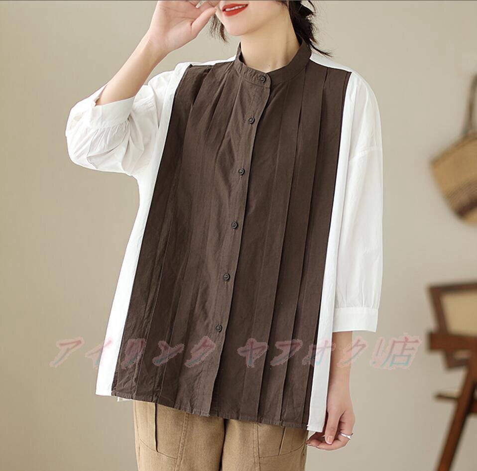 > ☆新品サイズ選択可 春夏 チュニック レディース コットン シャツブラウス 配色 トップス ゆったり 着心地 可愛い コーヒー