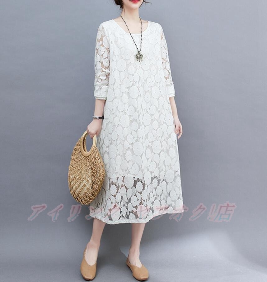 > ☆新品サイズ選択可 レースワンピ ロングワンピース レディース 総レース 可愛い長袖 森ガール 体型カバー 膝下綿混 白