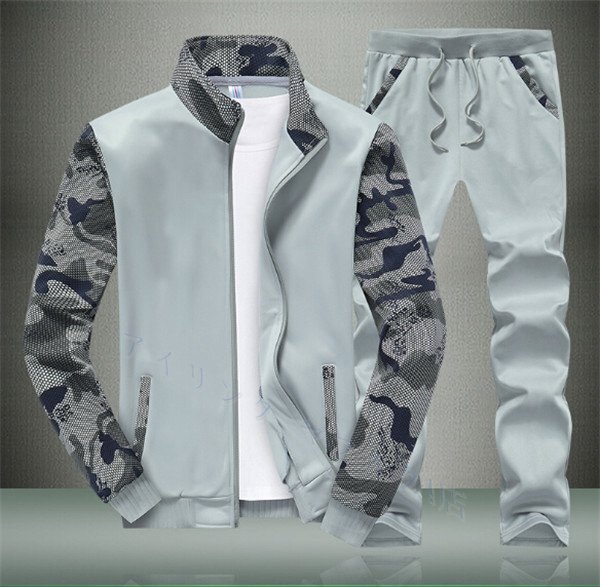 > ☆新品春秋 メンズジャケット 迷彩柄 切替 上下セット メンズジャージ トレーナー セットアップ アウター カジュアル グレーXL~4XL