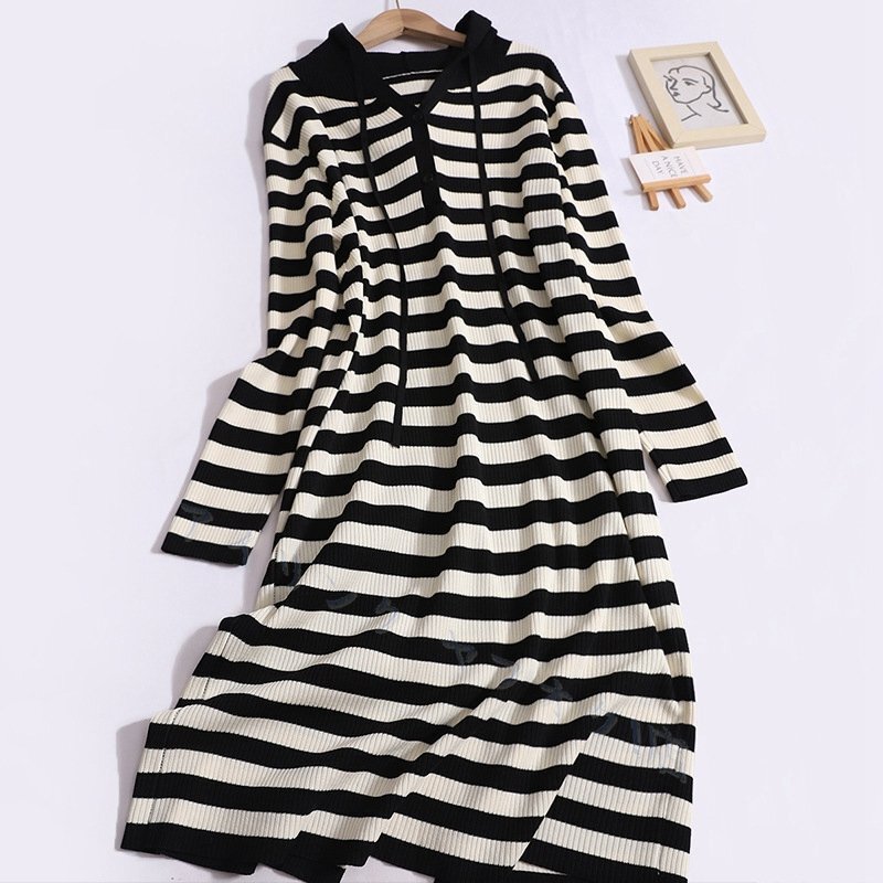 - ☆新品秋ニットワンピース 大人 長袖 きれいめ ボーダー柄 ロングワンピースフード付き 上品 大人 着やせ マキシワンピース杏