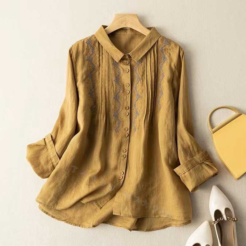 - 新品☆夏物 お色選択可 リネンシャツ レディース ブラウス 綿麻混 刺繍入り シャツブラウス 長袖 シャツ ゆったり 着心地 可愛い