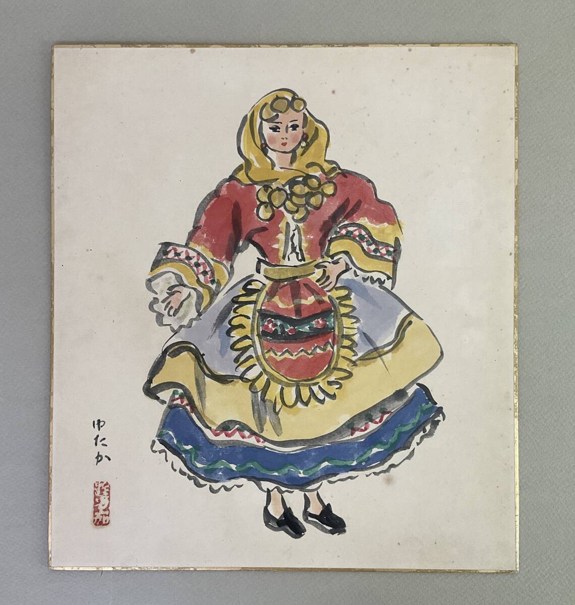 - 《真作》1030 ◇ 田坂ゆたか ギリシャの人形 色紙 ◇ 水彩画家 石井柏亭の四女 一水会 日本水彩画会名誉会員