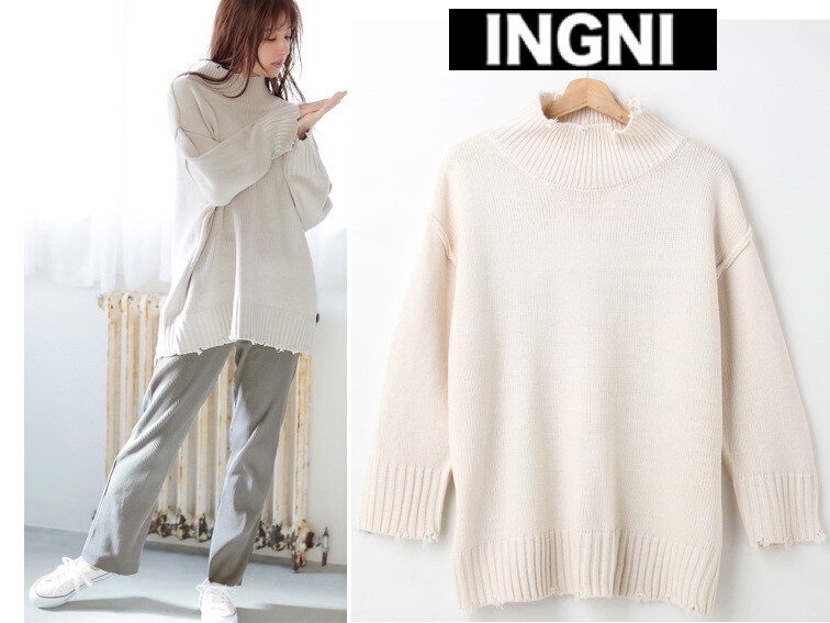 > ★送料込★M【新品5390円 INGNI】天竺ブロークン モックネック チュニック ニット オーバーサイズ 9号ー11号 クラッシュニット