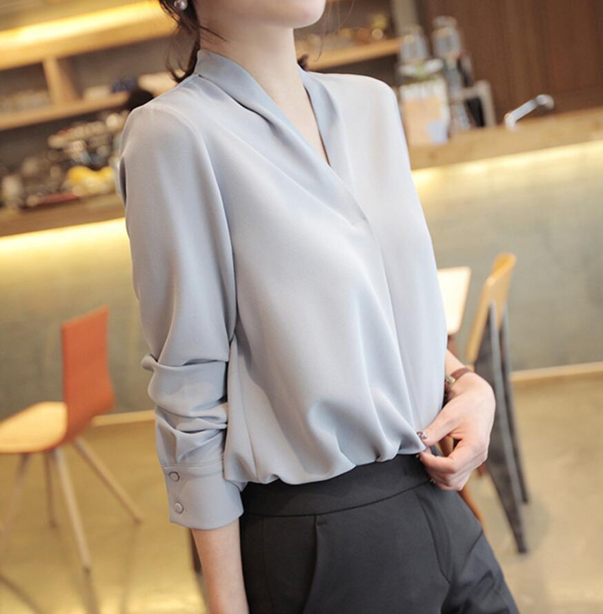 - 秋新作/ブラウス レディース シャツ 長袖 Vネック フォーマル シフォン トップス カジュアル 無地 普段着 オフィス 通勤 OL 制服 事務服/灰