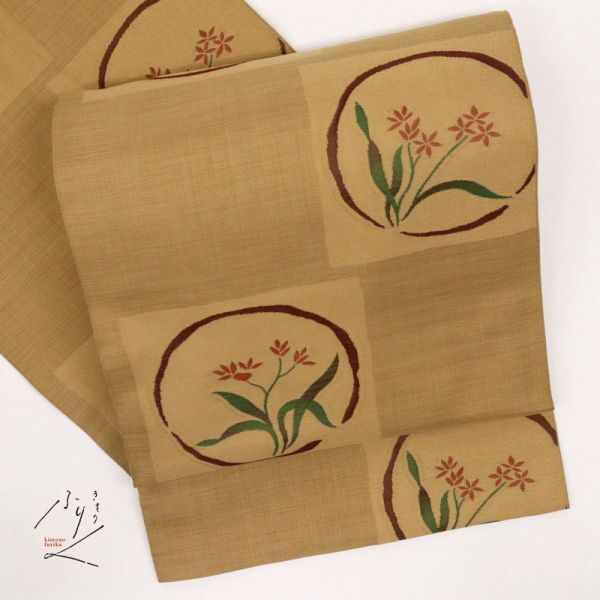 - 【袋帯】 今川織物 『木屋太』 花の丸紋 ベージュ 六通柄 正絹着物 FY7-7