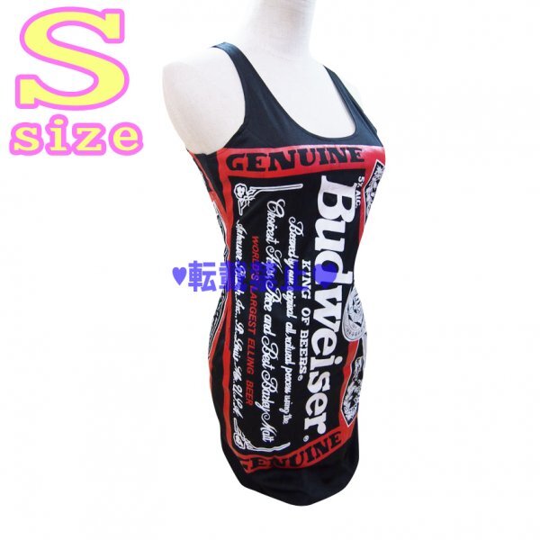 > 【高品質プリント 伸縮可能】バドワイザーバドガールクルーネックワンピース ブラック 黒 コスプレ S 送料無料 新品未使用