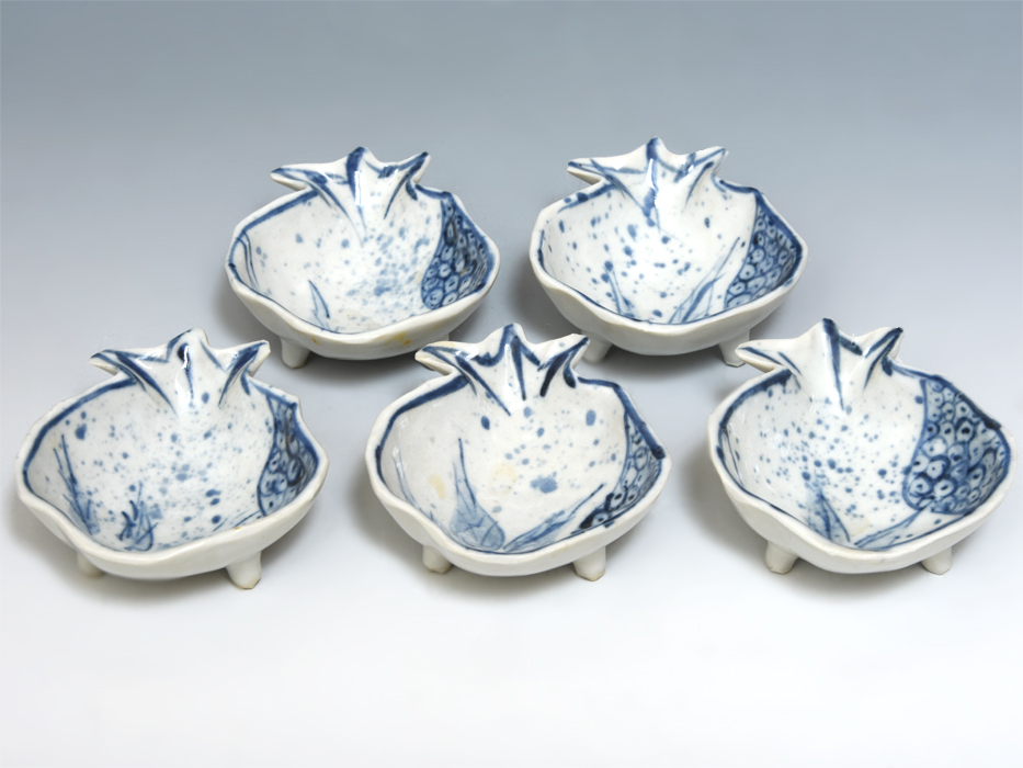 - 無銘 染付柘榴足付向付 5客 陶磁器 和食器 料理皿 懐石道具 茶懐石 ザクロ z8758a