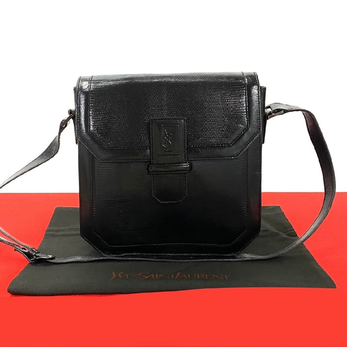 - 極 美品 YVES SAINT LAURENT イヴ・サンローラン ロゴ エンボス レザー 本革 ミニ ショルダーバッグ ポシェット ブラック 黒 28657