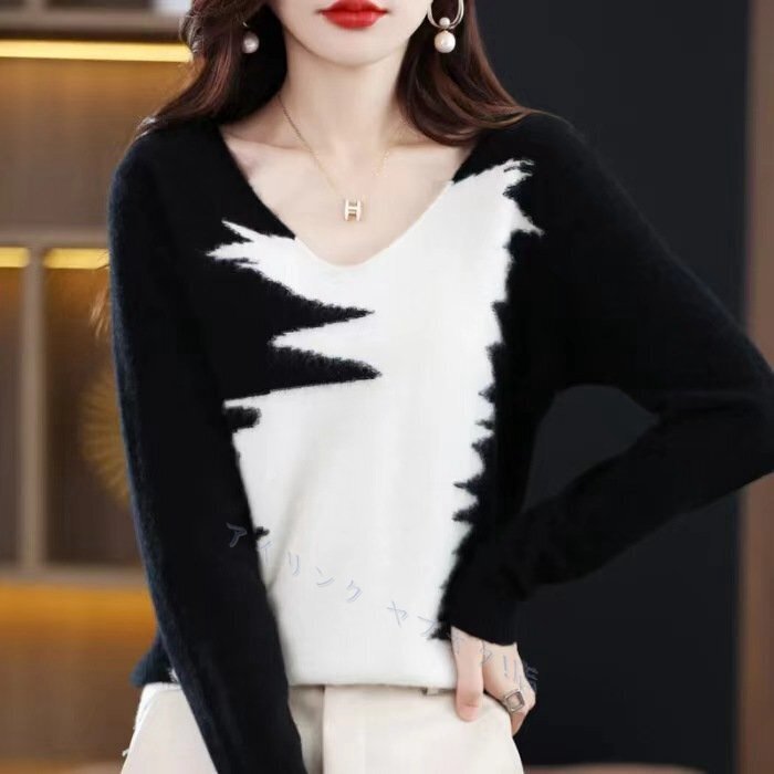 > ☆新品M-XLサイズ 優雅で Vネック ミンクカシミヤ混 ニットセーター 配色切り替え 柔らかい トップス 長袖 シンプル