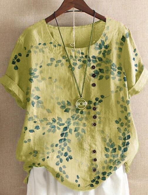 - ☆新品推薦 夏 ブラウス 大きいサイズ 綿麻 カジュアル ゆったり きれいめ プリント柄 半袖 トップス チュニック グリーン