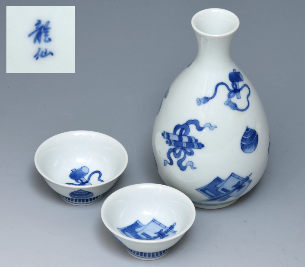 > 伝統工芸士 市川龍男(造)龍仙窯 鍋島焼 染付宝珠文徳利 酒杯2 酒器セット 酒盃 盃 杯 猪口 懐石道具 茶懐石 和食器 増崎龍男 z8537o