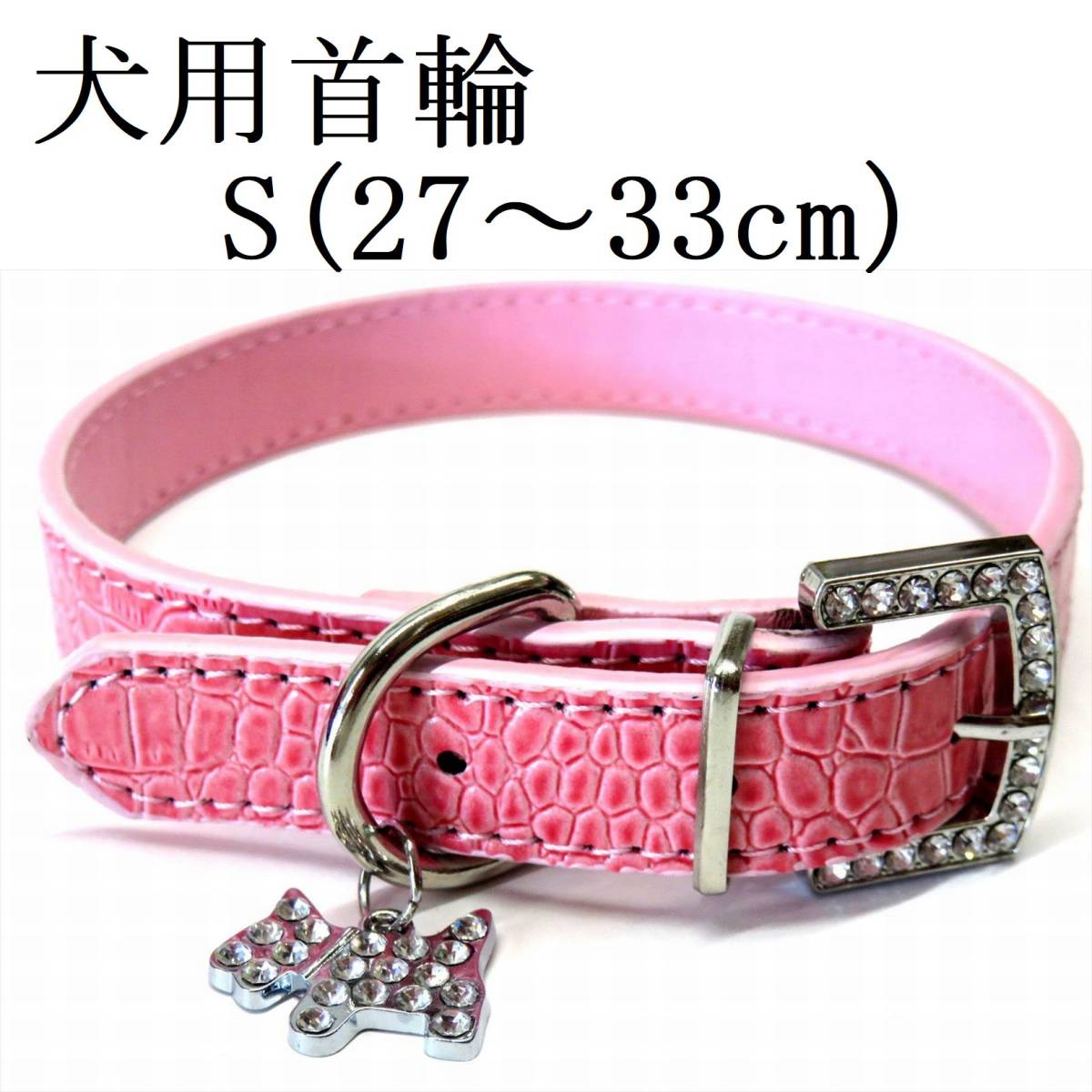 > 首輪 S ピンク 首回り27~33cm前後 幅1.3cm 小型犬 クロコダイル柄 PUレザー ワニ柄 イヌ型 キラキラ チャーム付き 犬用 散歩