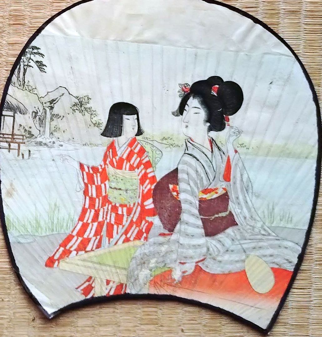 - f24112229〇彩色木版画 団扇絵 女性2人 大正時代〇和本古書古文書