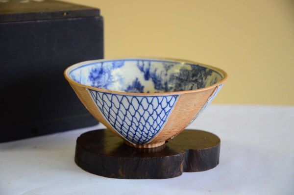 ご落札者様のために誠心誠意ご対応させていただきます染付 骨董 茶碗 木製土台 山水画 茶道具 旧家蔵出し アンティーク 縦9cm 直径15cm