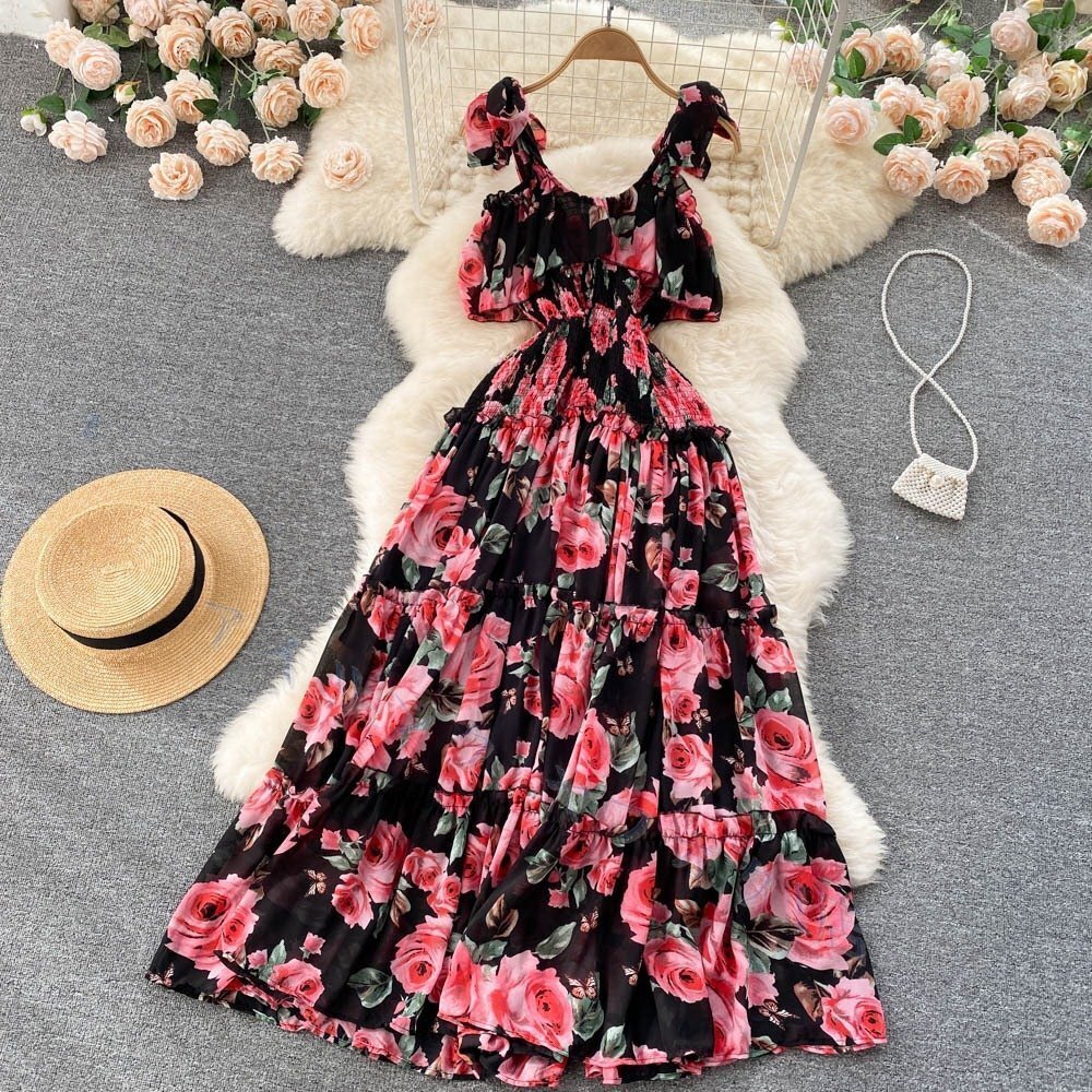 - 新品キャミソールワンピース 花柄 ワンピース レディース ノースリーブワンピース プリント 夏 ハワイアンスタイル ブラック