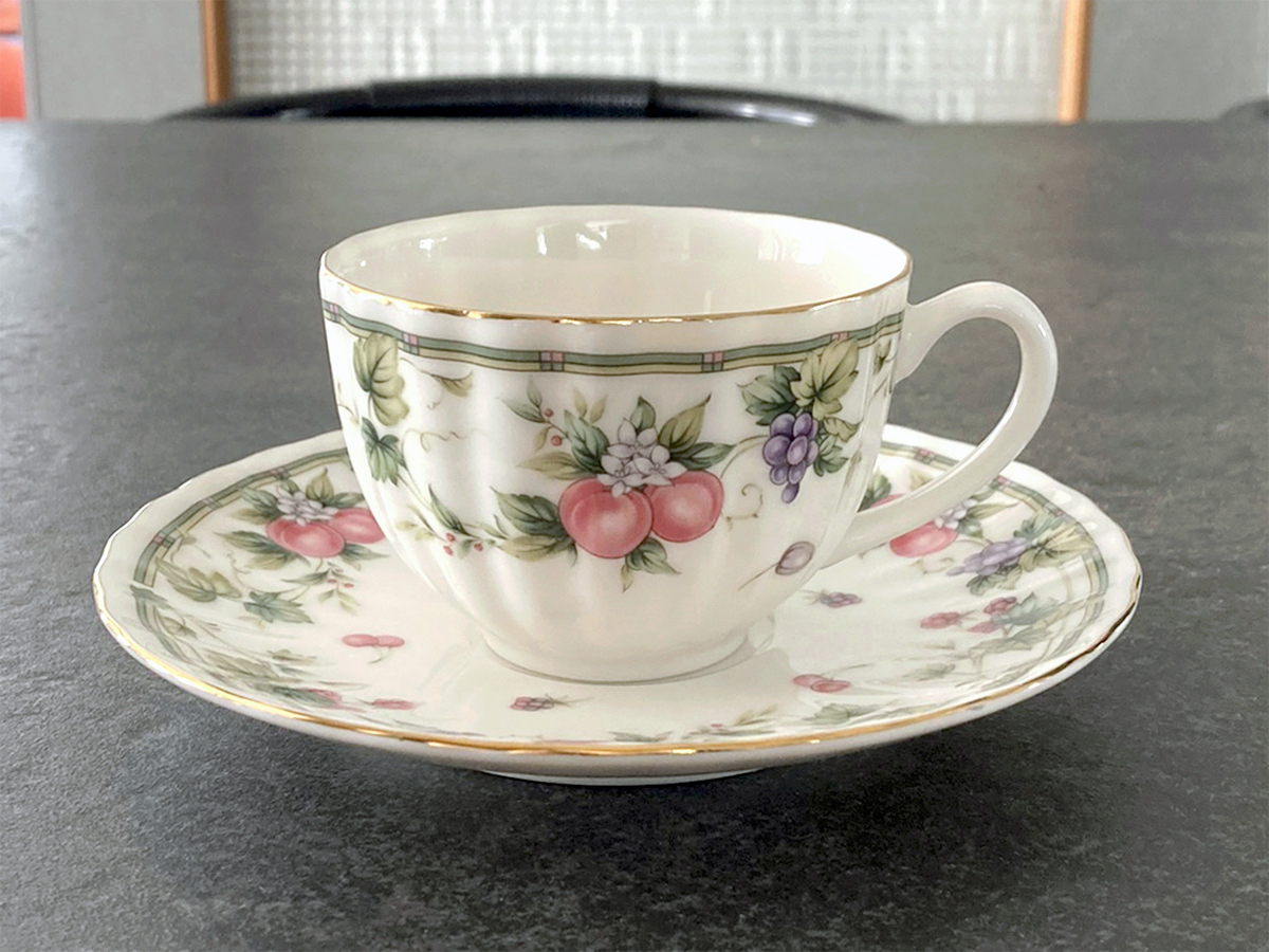 > New Bon La Seine ◆ティーカップ*カップ&ソーサー◆日本製/花柄 ベリー 果物 桃 ぶどう さくらんぼ 白 ラ・セーヌ 食器 金彩 紅茶 可愛い