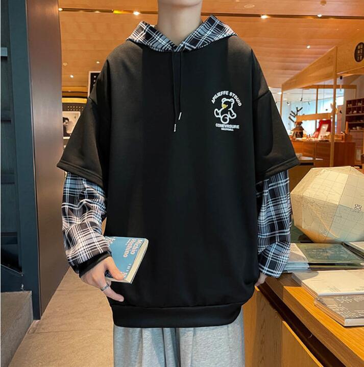 - 裏起毛 トレーナー 厚手 メンズ トップス 韓国風 重ね着風 チェック柄 長袖 フード付き ゆったり 秋冬 大きいサイズ 2色S-5XL