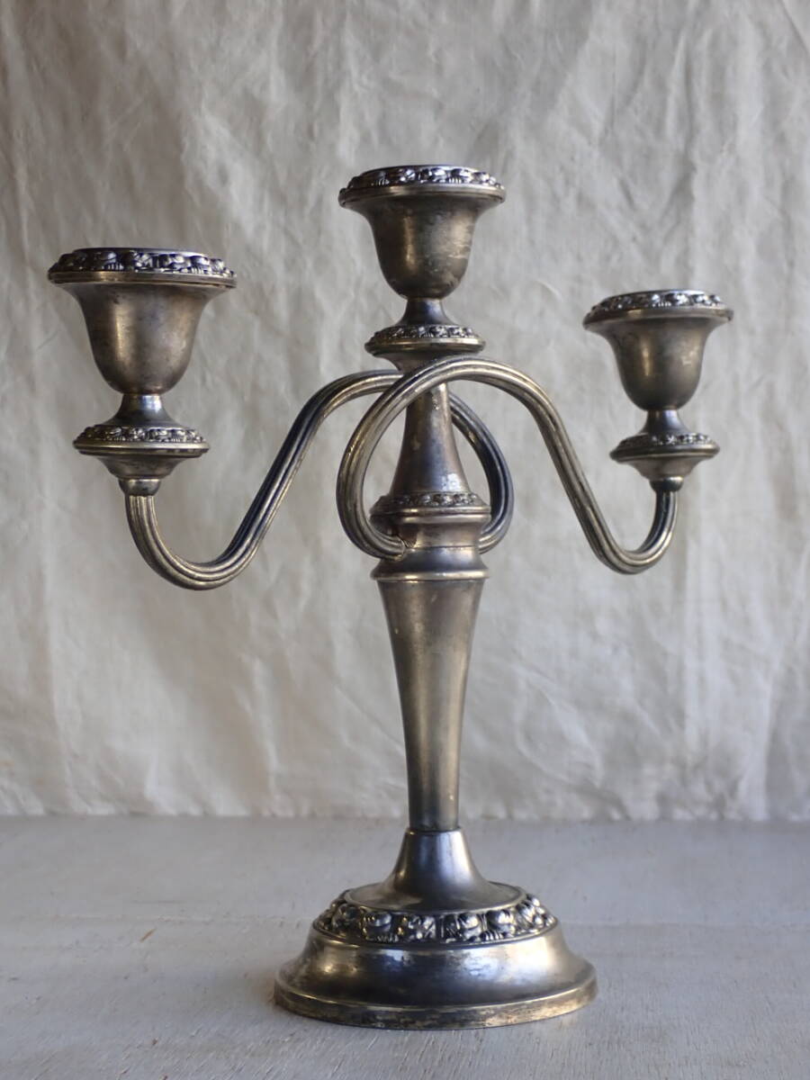 - フランスアンティーク 3灯 キャンドルスタンド シルバープレート 銀メッキ シャビーシック 蚤の市 ブロカント 蝋燭立て t