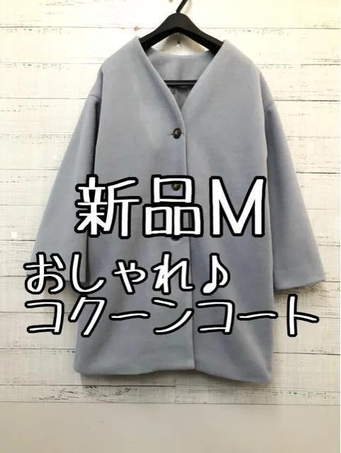 - 新品☆M♪サックス系ウール調おしゃれノーカラーコート♪コクーン☆e263
