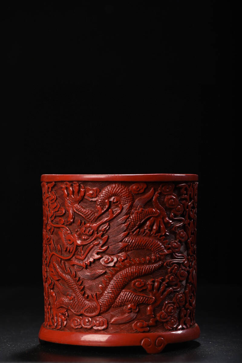 - ▽鴻▽ 漆器漆彫 剔紅 龍紋筆筒 置物 古賞物 中国古玩 中国古美術
