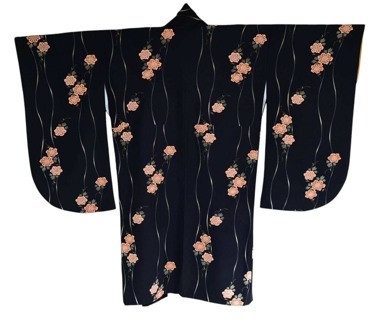 - ニ尺袖 女性用 ショート丈 花柄 黒系 身丈約 110cm 肩裄約69cm 袖丈約74cm 卒業式謝恩会 振袖 着物 袴 和装小物 同封可