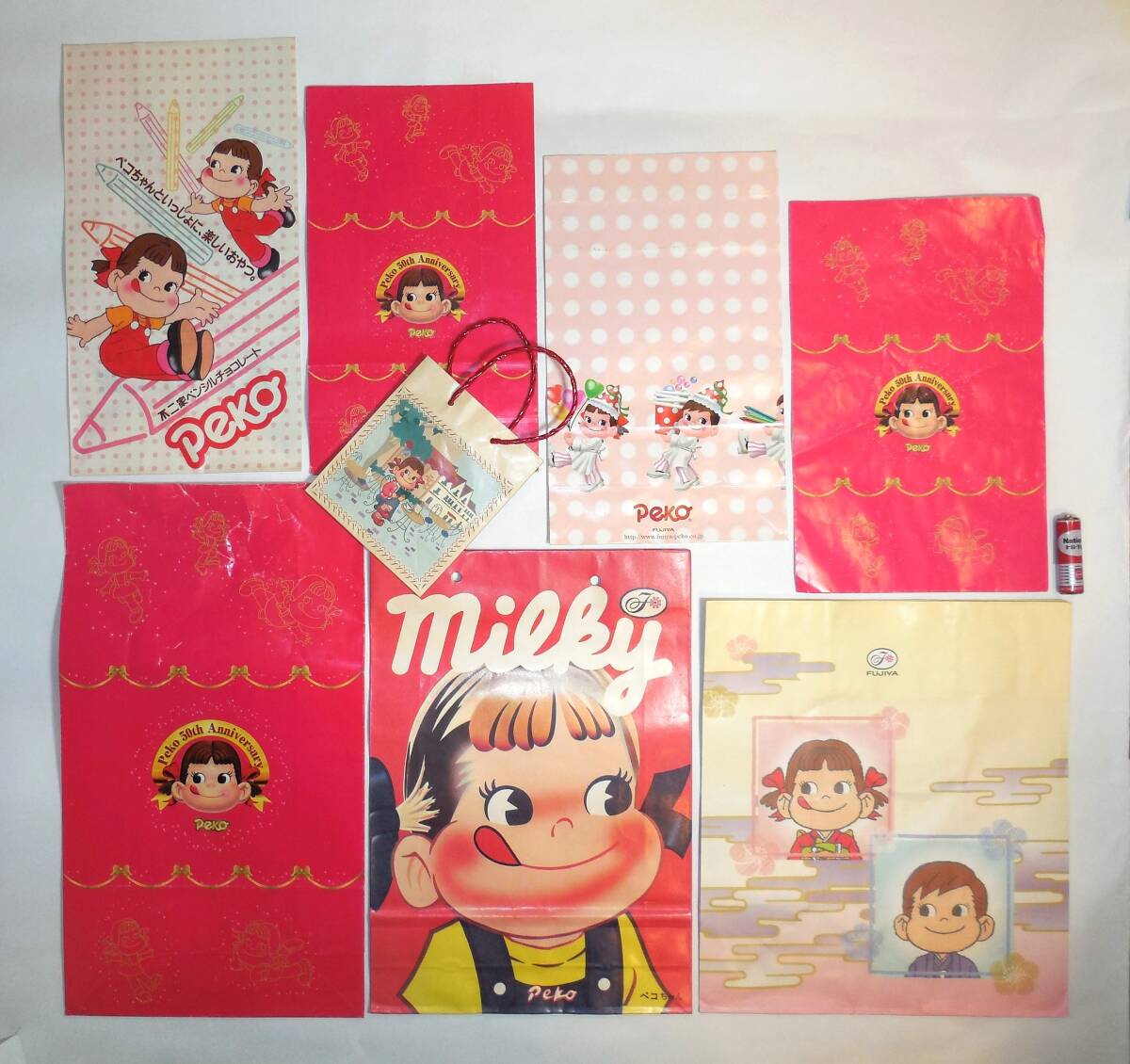 - 不二家 ペコちゃん ペンシル チョコレート、50th Anniversary など 紙袋 空き袋 8点