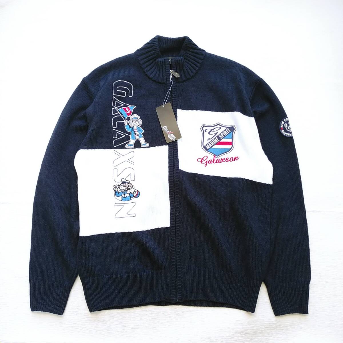 > 未使用 GALAXSON SPORTS ギャラクソン ジップアップニット ゴルフ メンズM 紺白 アニマル柄 マリン刺繍 モックネック 241206-03