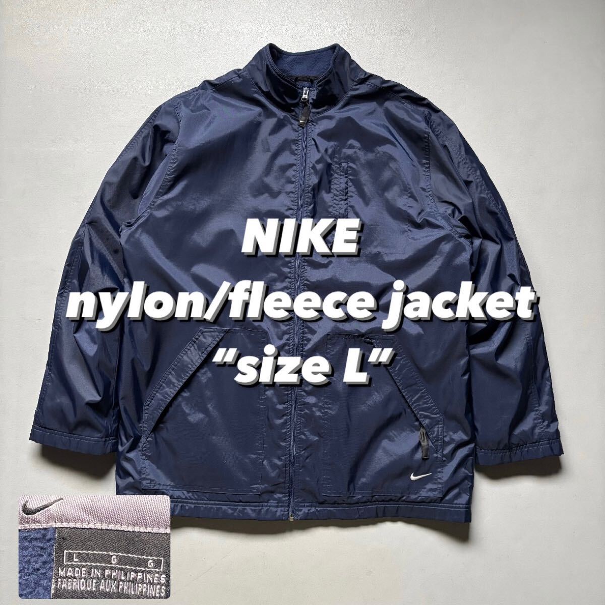 > NIKE nylon/fleece jacket “size L” ナイキ ナイロンジャケット 裏フリース 紺 ネイビー ミドル丈 裾スウォッシュ ブルゾン
