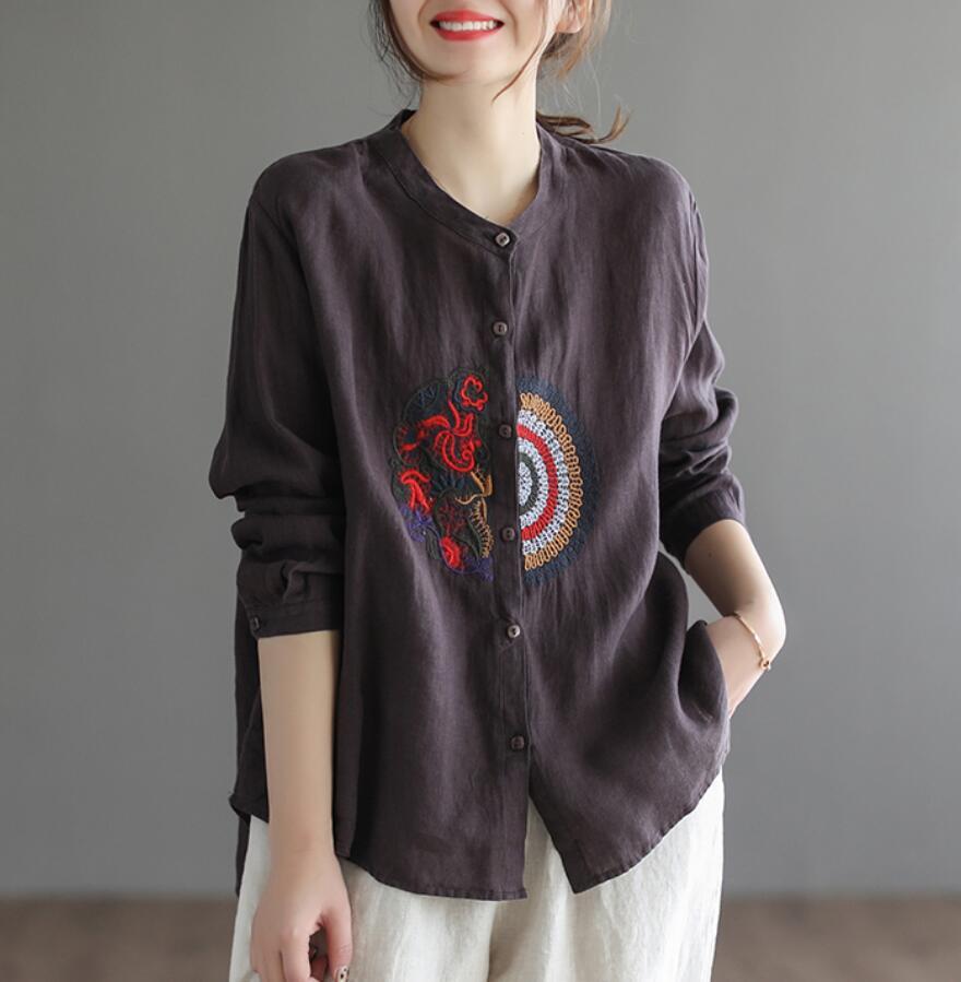 - 新入荷*チュニック トップス レディース 刺繍入り 大きいサイズ 綿麻シャツ ブラウス 長袖 シンプル ゆったり*コーヒー