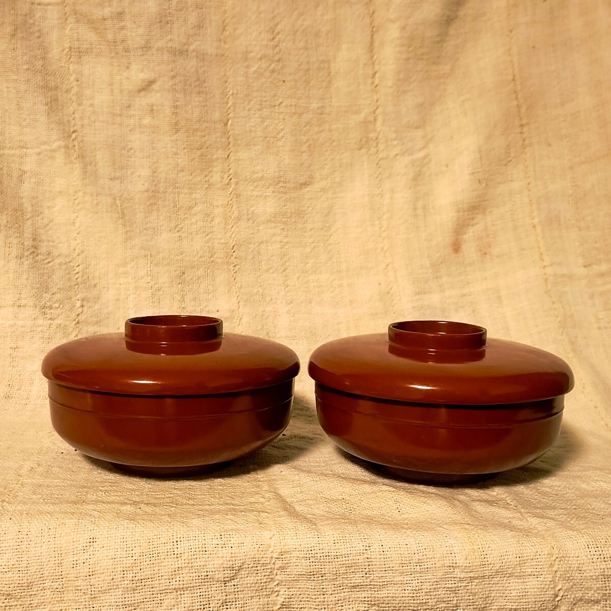 - 時代物 朱塗 蓋付き 煮物椀 胴紐 2個組 検) 汁椀 木製漆器 雑煮椀 古民芸 骨董 古道具 民芸