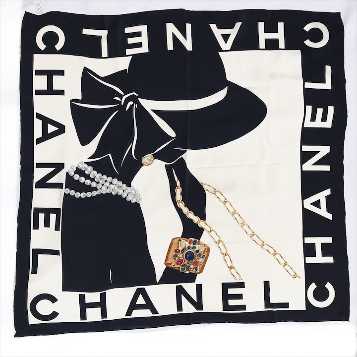 > 良品 CHANEL シャネル マドモアゼル 大判 スカーフ ブラック シルク 100% レディース k4552