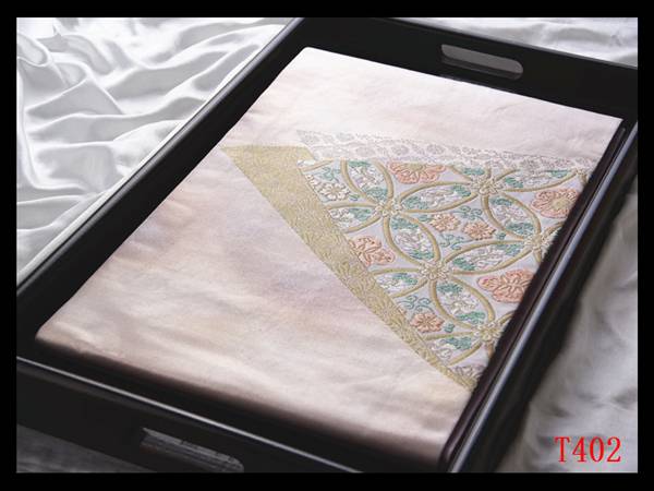 - 蔵【T402】厳選逸品 七宝唐草花紋 白藤色地 気品豊かに 正絹純金糸高級美術名古屋帯 ◇検◇簪着物袋帯和装小物帯締め