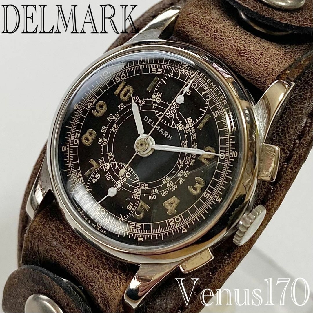 > 942 超希少!DELMARK クロノグラフ VENUS170 ブラックダイヤル 腕時計 手巻き 1940年代 アンティーク 稼働良品 美品