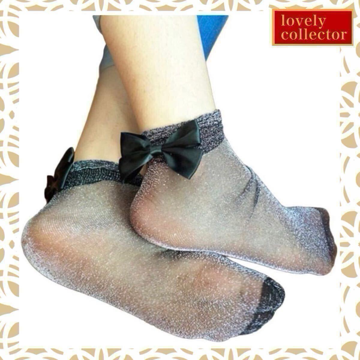 - レディース ガールズ キラキラおしゃれソックス リボンカラー ブラック 黒