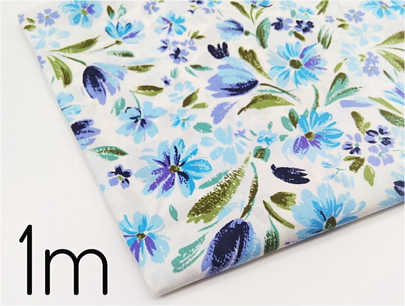 - 【1m】水彩風 花柄 ホワイト×ブルー★綿 コットン シボ★ハギレ 生地 布 カットクロス ハンドメイド 手芸 裁縫 入園 入学 フラワー