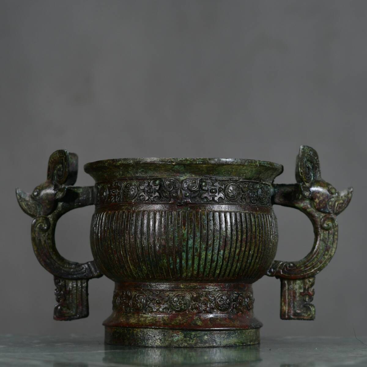 - ◆旧家蔵出◆古美術 中国古玩 戰國時代 古銅製 青銅器 銘文 双耳盆 置物 擺件 古賞物 骨董 時代物 AT17