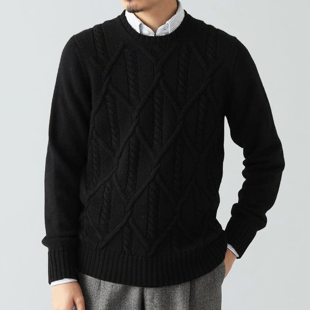 > Drumohr ケーブル クルーネック ニット セーター 44 ドルモア 最高級 メリノウール生地 ミドルゲージ ブラック 定価4万 イタリア