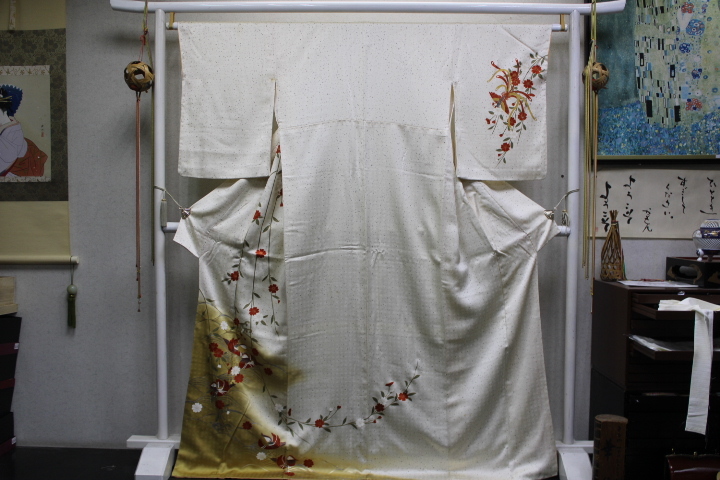 > きもの今昔8034 附下訪問着 広衿袷手縫い仕立きもの 高級正絹綸緞子地 アイボリー地枝垂れ桜の柄 身丈171cm