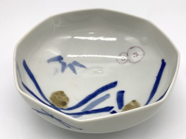 - 【骨董陶器】白磁色絵 松竹梅図 『八角鉢』 状態良好 O0126A